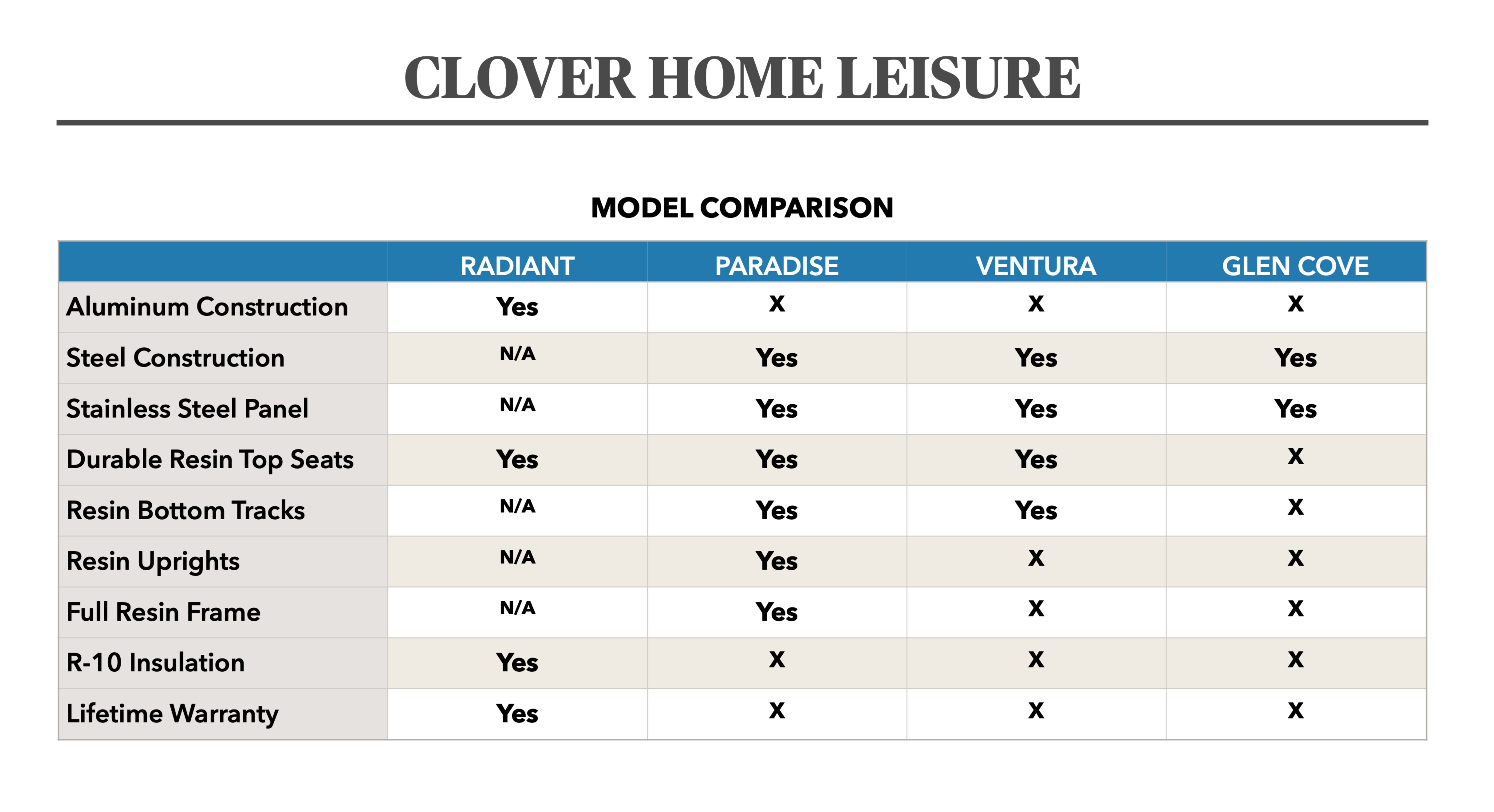 The Radiant Pool is made completely from aircraft grade Aluminum. Both our Paradise and Ventura Pools have Rust Free Weather Tested Resin Top Seats and Bottom Tracks for longer life.